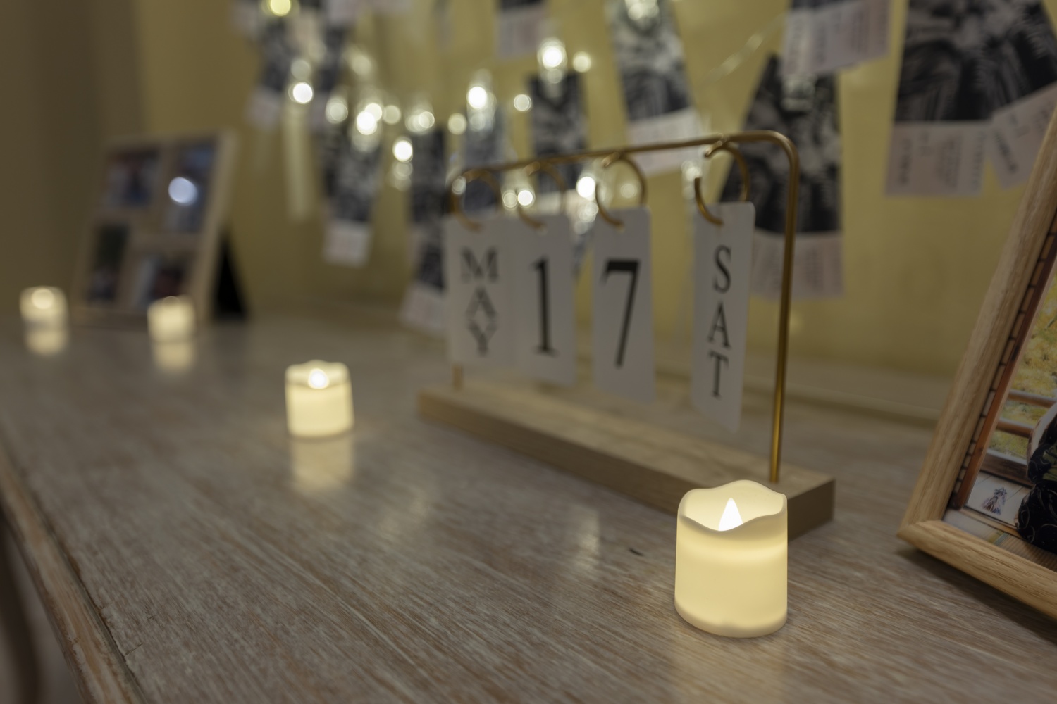 結婚式当日は雨予報でしたが、過ごしやすいお天気でした。お待合スペースには手作りのウェディングツリーや前撮りのお写真を飾っておふたりらしさを演出いたしました。