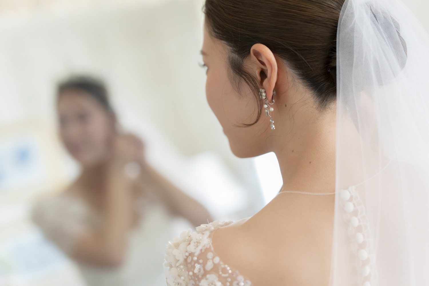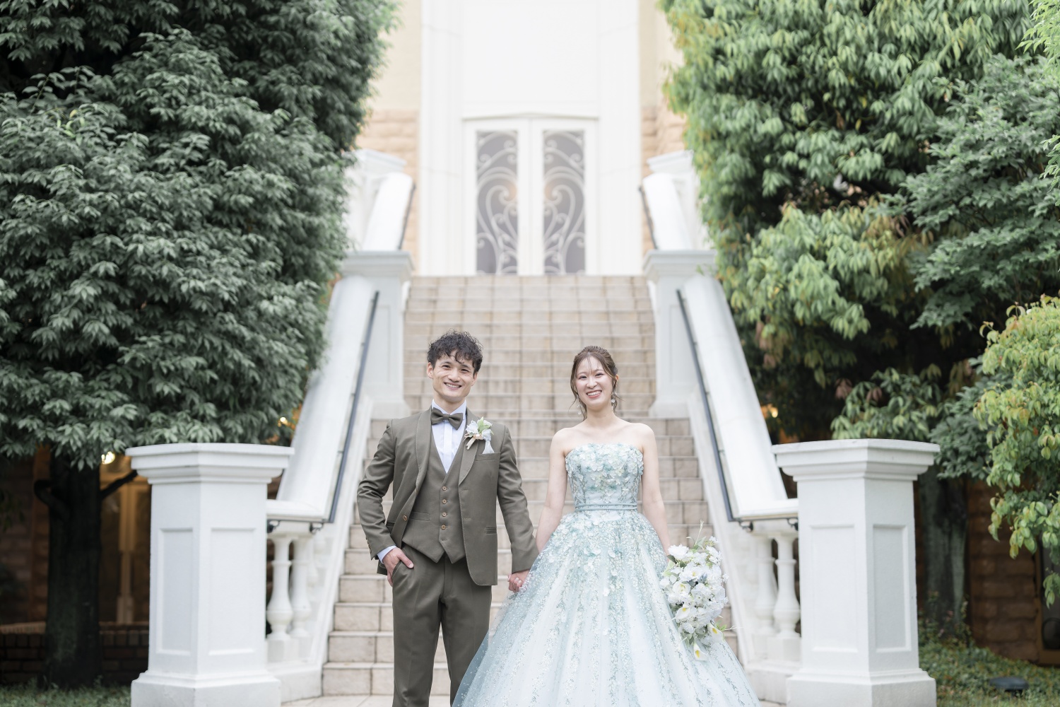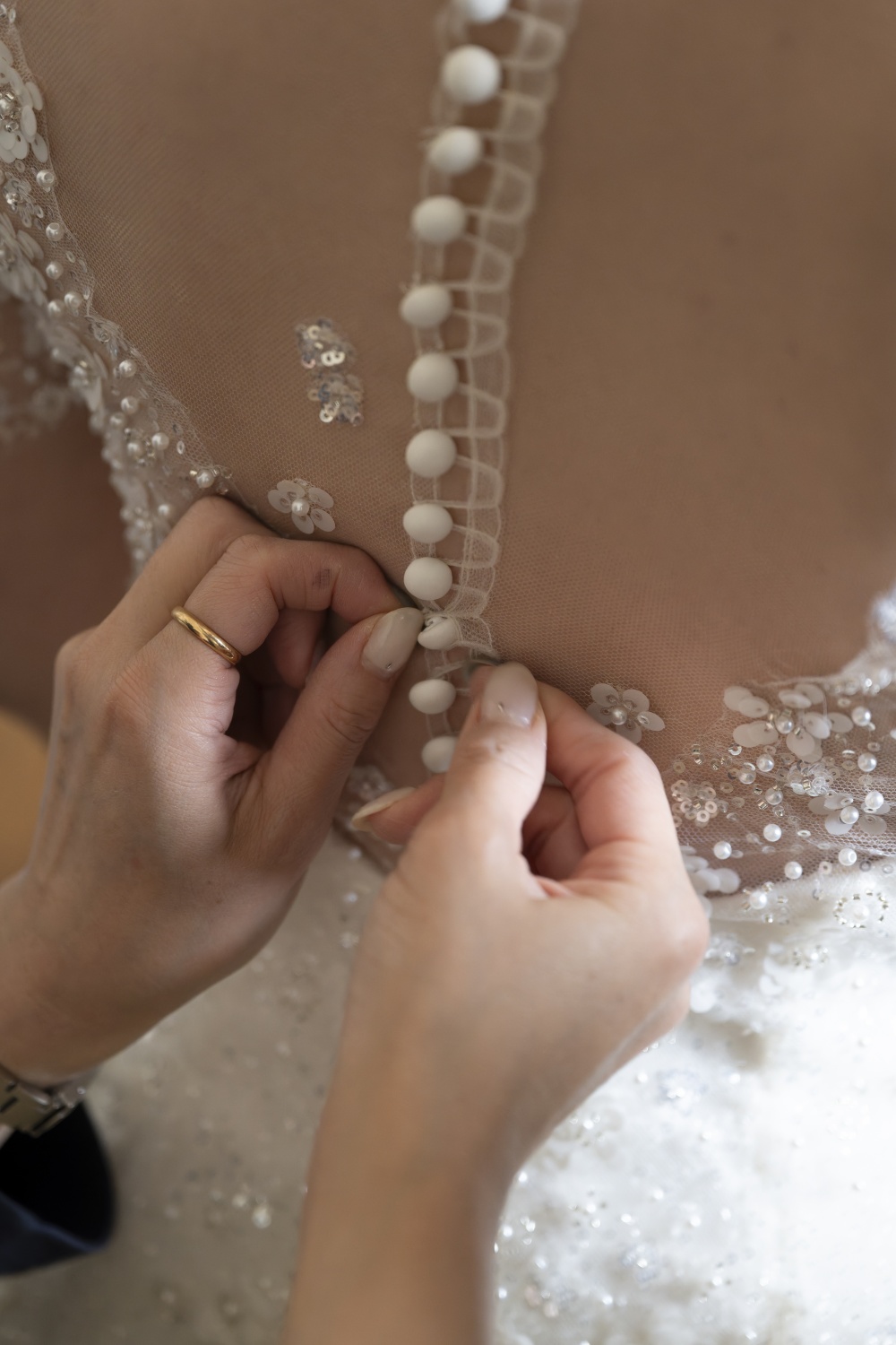 お洒落が大好きなおふたり。お選びになられた衣裳もお気に入りでこだわったポイントの一つです。背中のくるみボタンとアクセントの王冠が新婦様をより上品かつ華やかに見せてくれます。