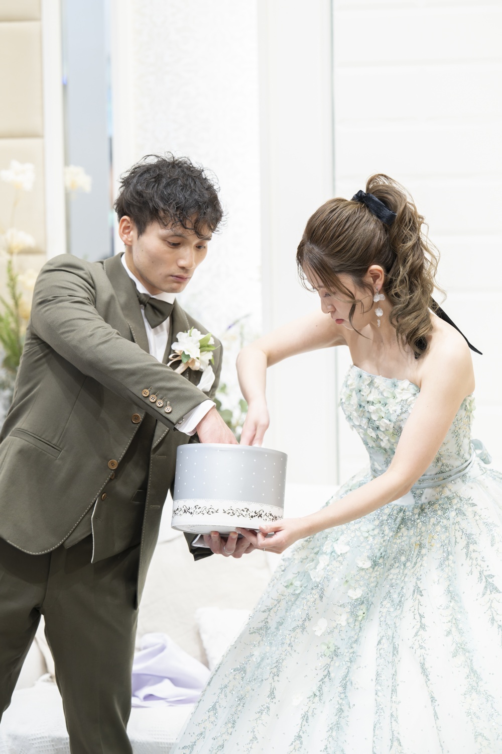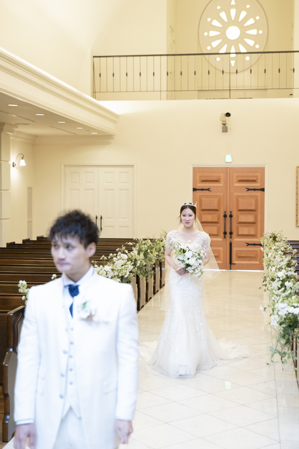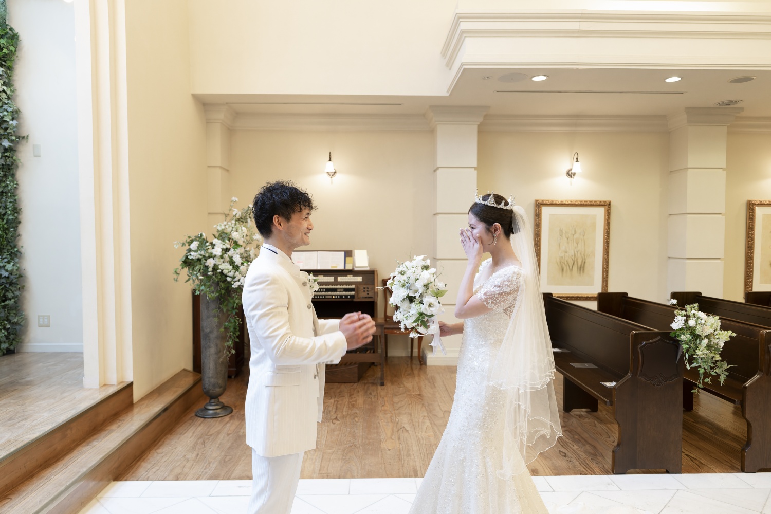 「ご結婚式当日まで選んだ衣裳は内緒にされたい」と新婦様のご希望でファーストミートを行いました。思わず涙があふれる新婦様を見て新郎様も涙されていました。