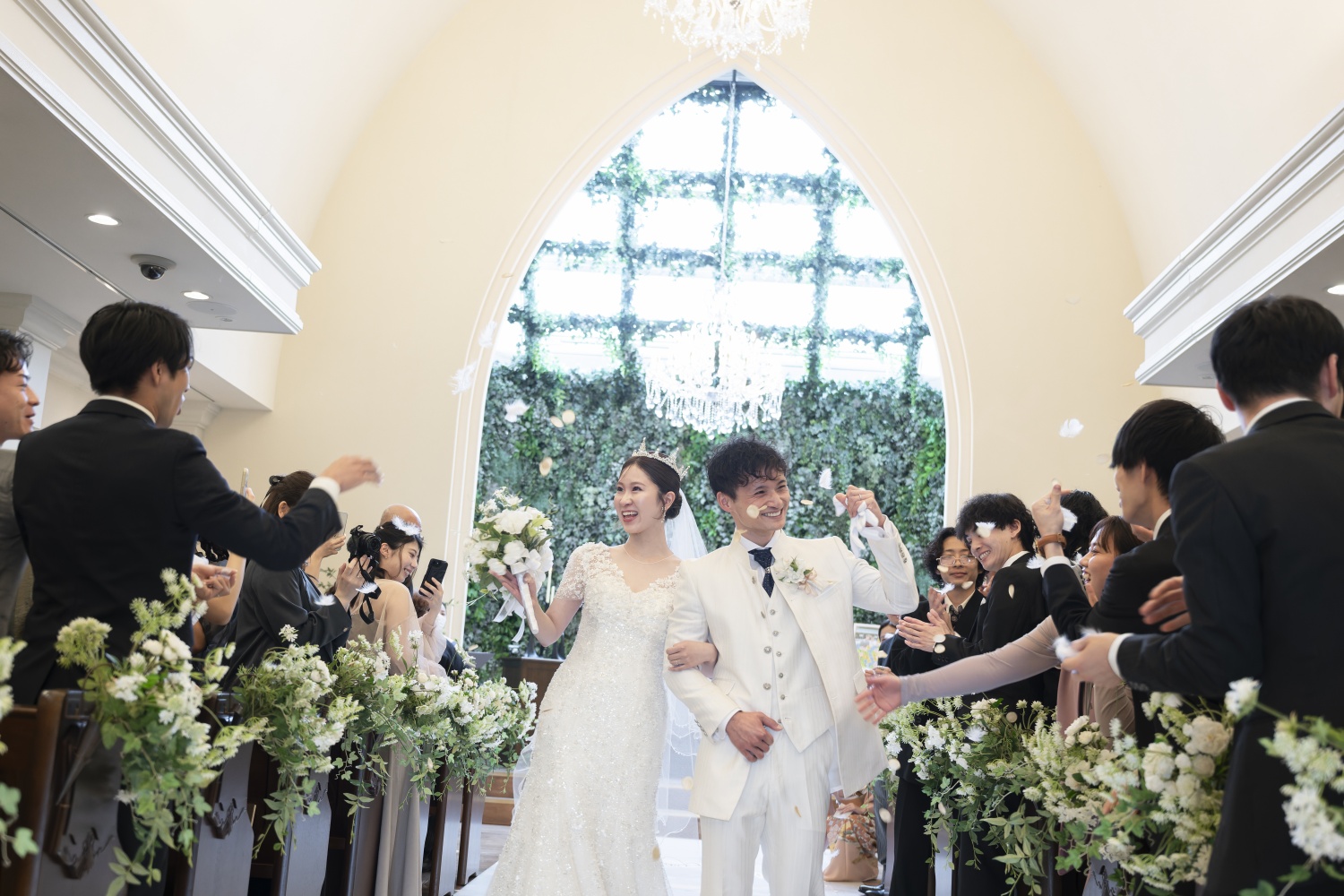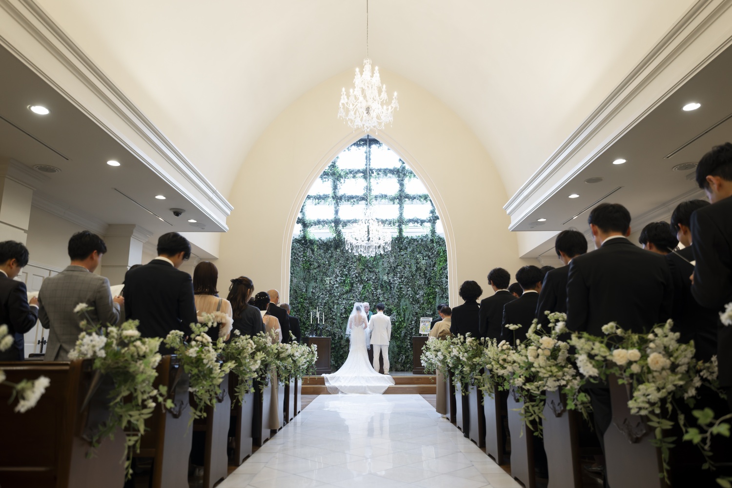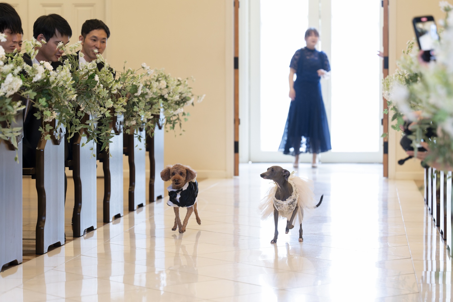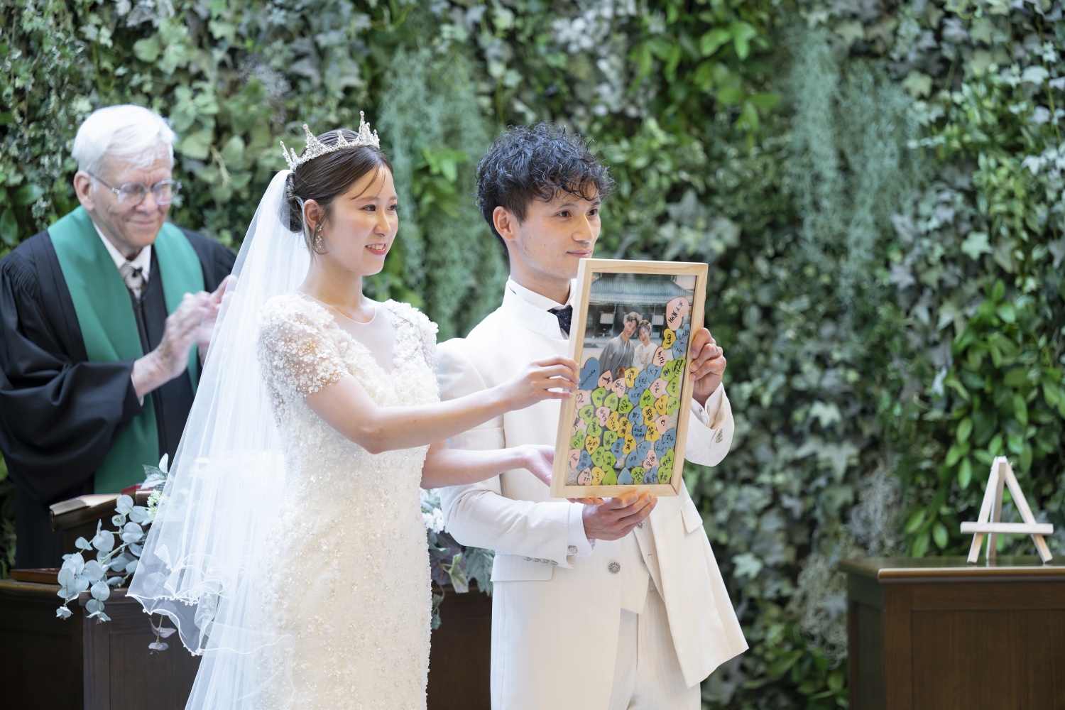 挙式はキリスト教式をお選びになられました。リングドッグやゲストの方にも参加していただいたオリジナル結婚証明書でおふたりだけのオリジナル挙式を演出されました。