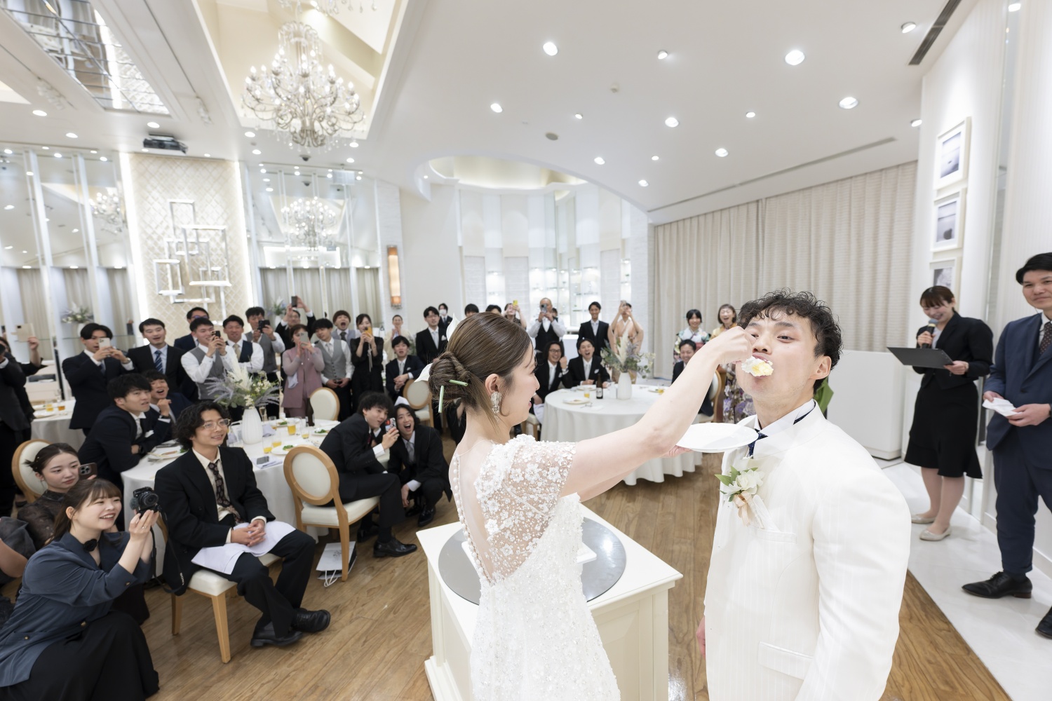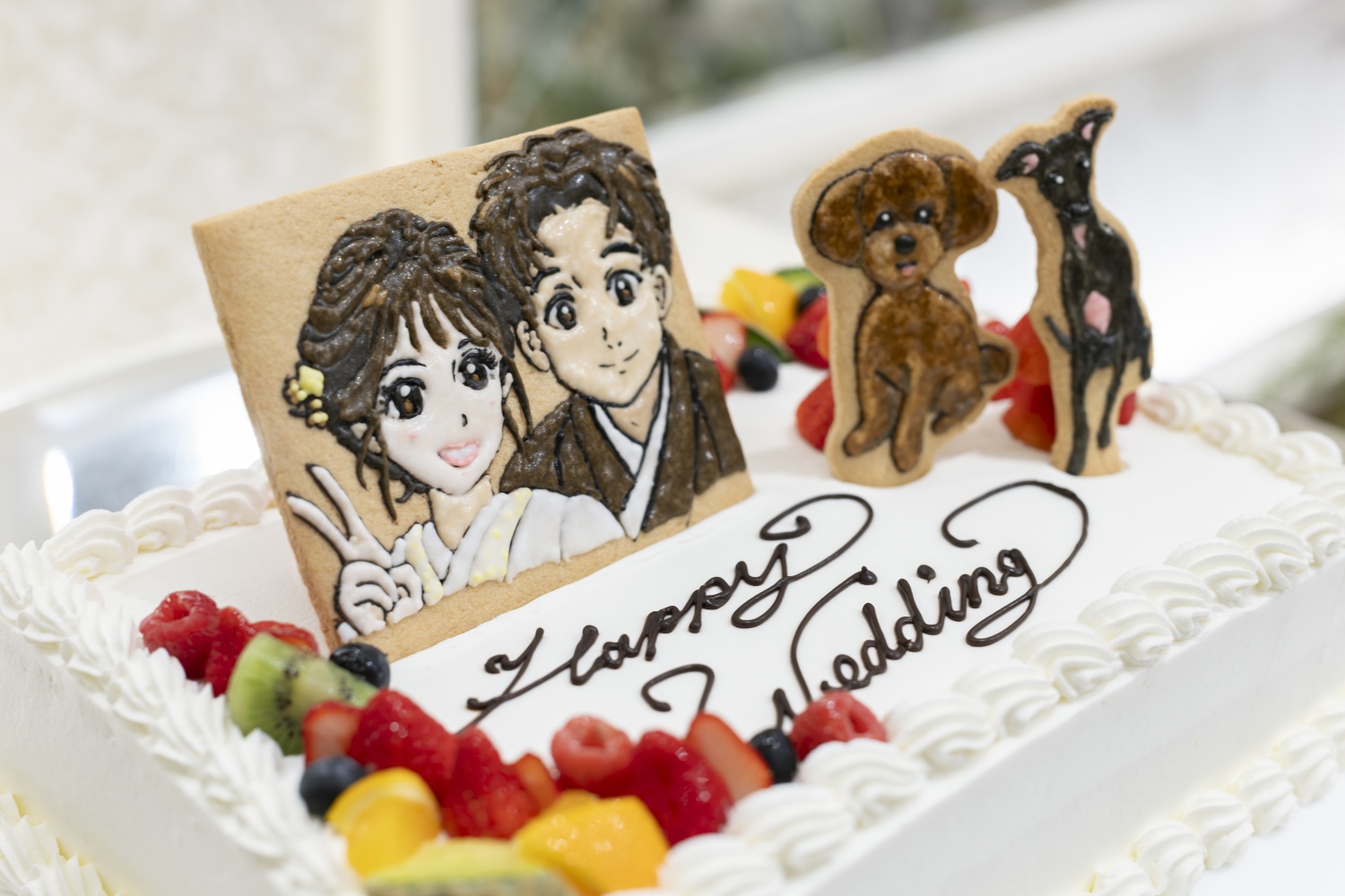 ウェディングケーキはおふたりの似顔絵付きです。デザートタイムに幸せのおすそ分けとしてゲストに振舞いました。