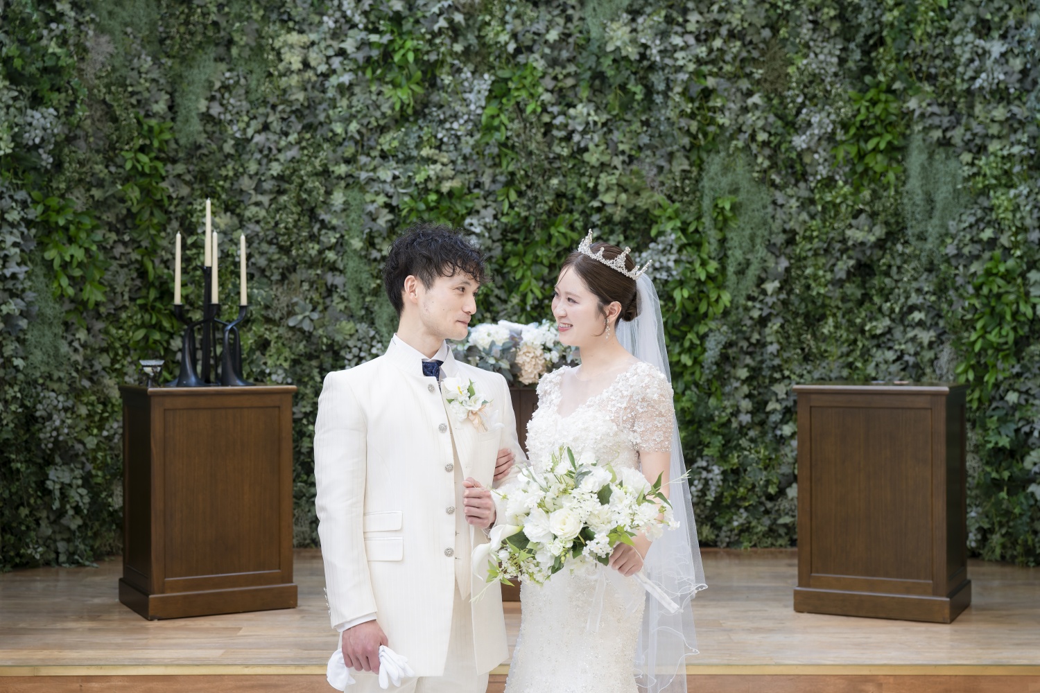 挙式はキリスト教式をお選びになられました。リングドッグやゲストの方にも参加していただいたオリジナル結婚証明書でおふたりだけのオリジナル挙式を演出されました。